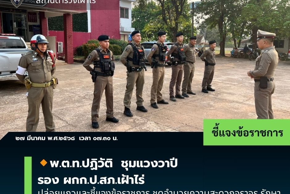 ชี้แจงข้อราชการ 27 March 2568 by Fr50 / ข่าวประชาสัมพันธ์,ข่าวกิจกรรม,ข่าวภารกิจผู้บังคับบัญชา,ข่าวประชาสัมพันธ์,งานป้องกันปราบปรามและจราจร ๒๗ มีนาคม พ.ศ.๒๕๖๘ เวลา ๐๗.๓๐ น. 🔸พ.ต.ท.ปฏิวัติ ชุมแวงวาปี รอง ผกก.ป.สภ.เฝ้าไร่ ปล่อยแถวและชี้แจงข้อราชการ ชุดอำนวยความสะดวกจราจร,รักษาความปลอดภัยฯ งาน ตรวจเยี่ยมสถานีอนามัยเฉลิมพระเกียรติ ฯ Facebook iconFacebookTwitter iconTwitterLINE iconLine