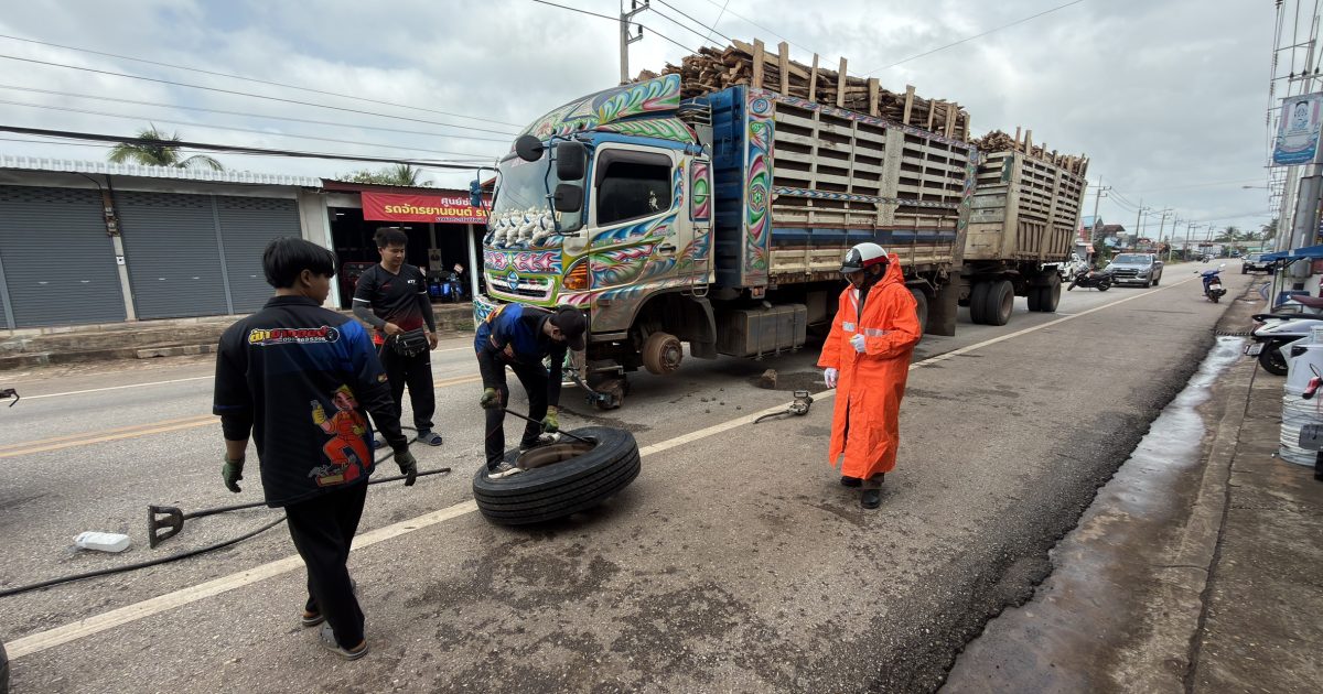 เจ้าหน้าที่ตำรวจจราจรอำนวยความสะดวกบนถนนให้กับประชาชนรถยางรั่วเป็นรถบรรทุกใหญ่