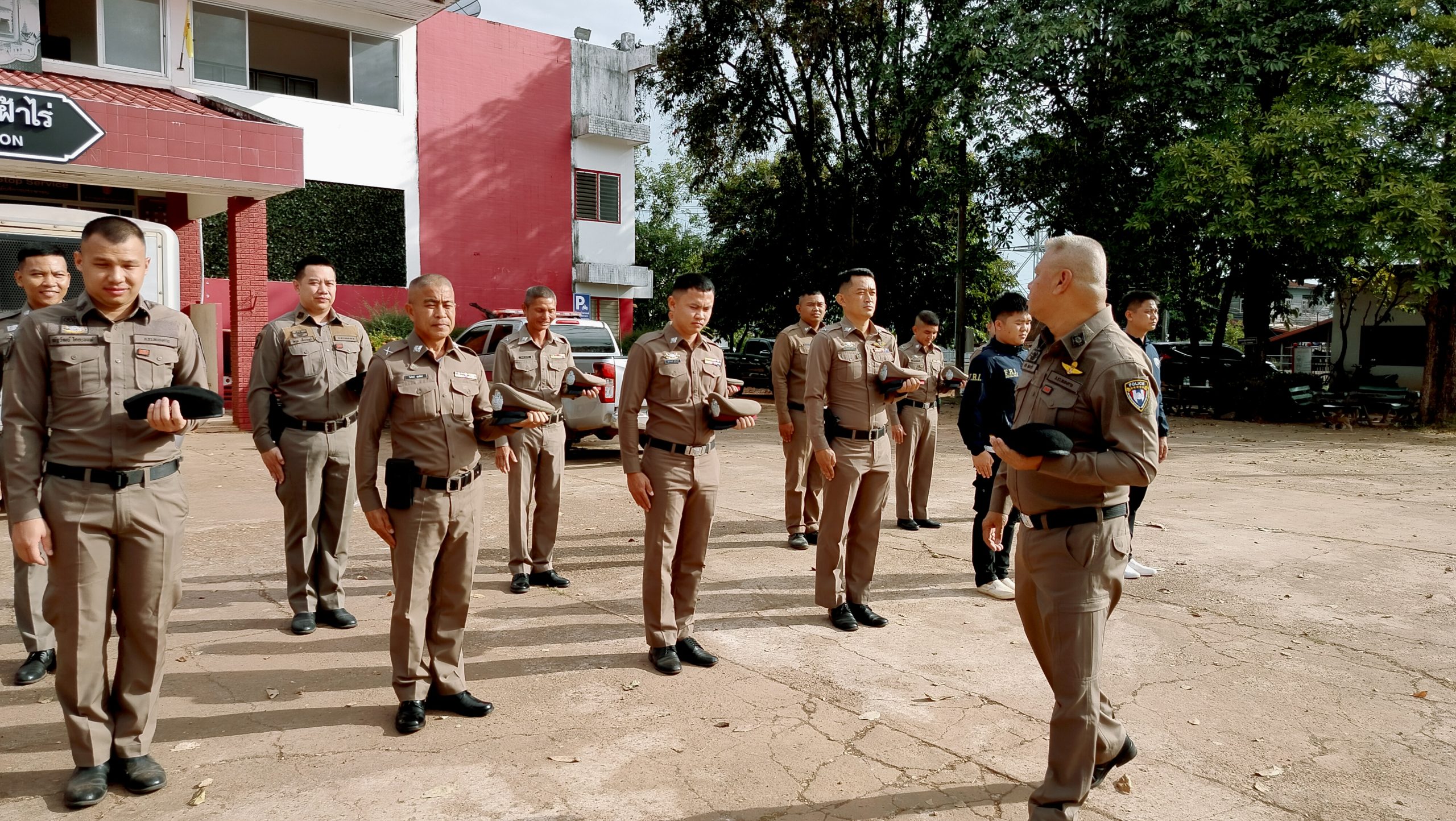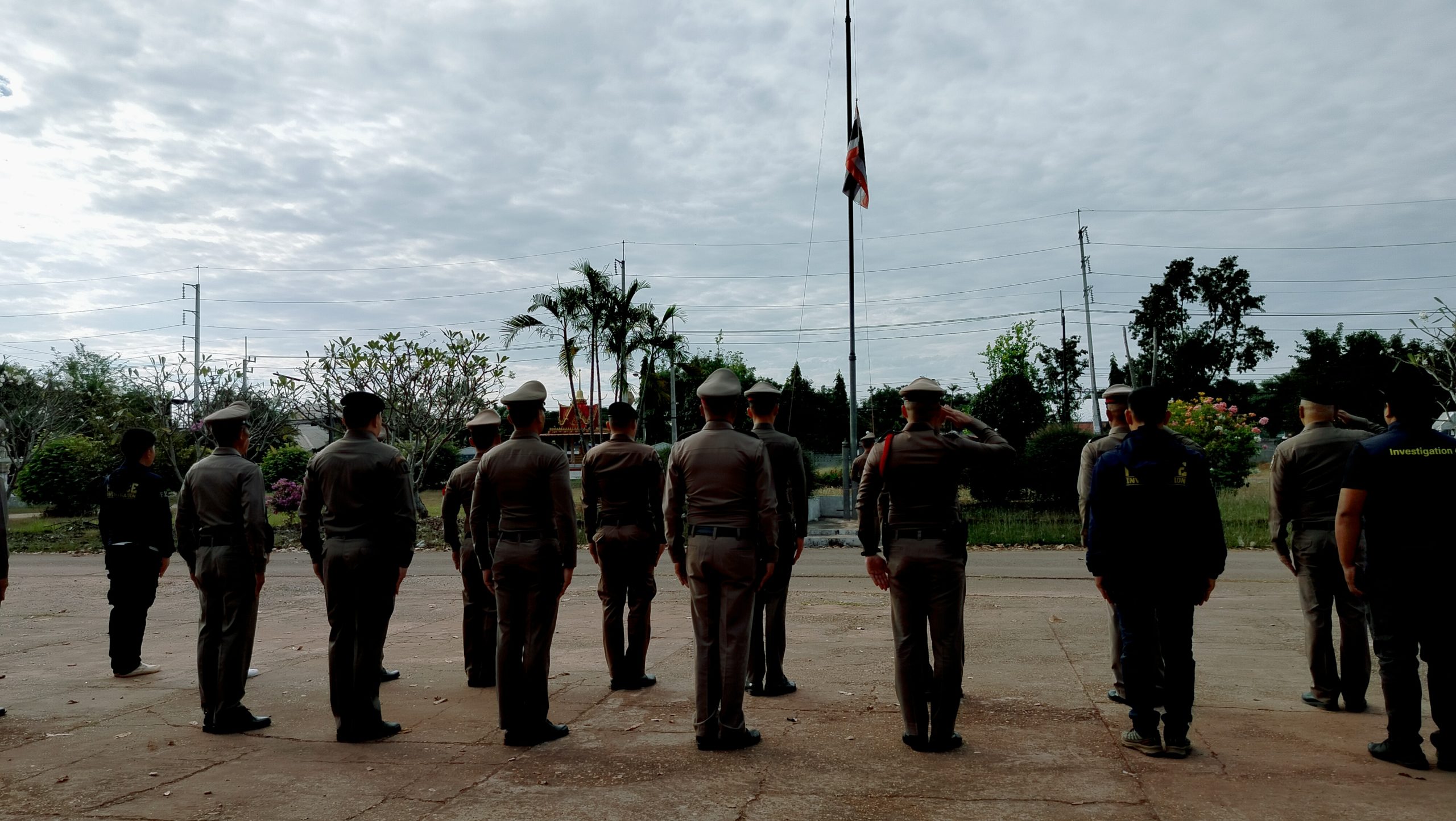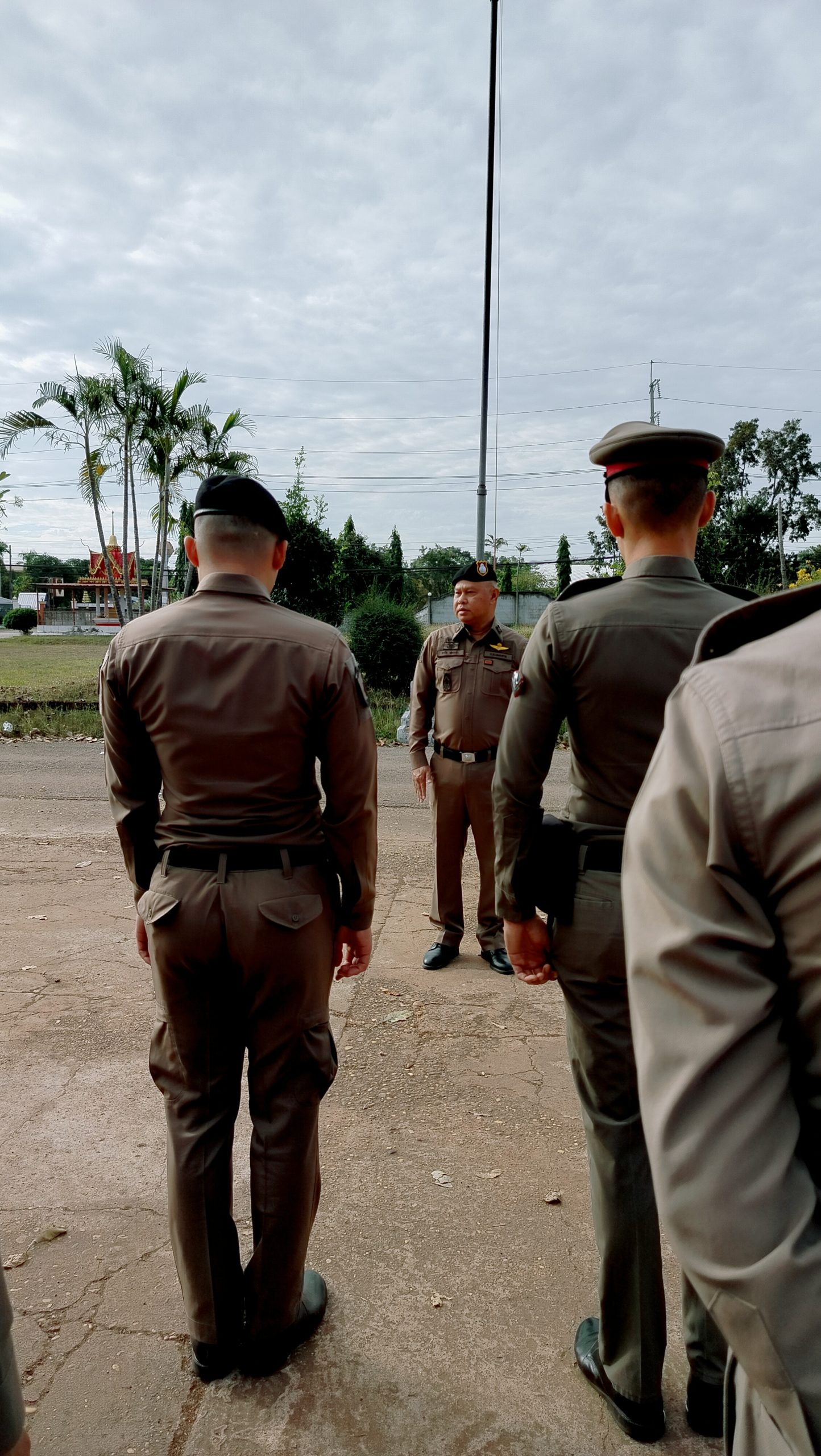 🔻นำข้าราชการผู้ใต้บังคับบัญชา เข้าแถวเคารพธงชาติตรวจทรงผม เครื่องแต่งกายทุกนายให้ถูกต้องตามระเบียบข้อสั่งการ ชี้แจงหน้าที่ข้อสั่งการและนโยบาย ระเบียบข้อบังคับ ตาม ว.0 พิทักษ์ 1และการให้บริการประชาชน