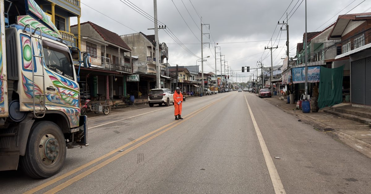 เจ้าหน้าที่ตำรวจจราจรอำนวยความสะดวกบนถนนให้กับประชาชนรถยางรั่วเป็นรถบรรทุกใหญ่