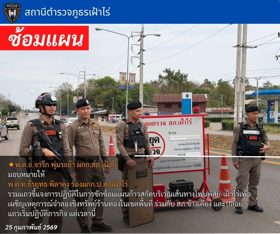 25 กุมภาพันธ์ 2569 เวลา 13.00 น. โดยการนำของ พ.ต.อ.จารึก พุ่มระย้า ผกก.สภ.เฝ้าไร่ มอบหมายให้ พ.ต.ท.ธีรยุทธ พิลาคง รองผกก.ป.สภเฝ้าไร่ รวมแถวชี้แจงการปฏิบัติในการซักซ้อมแผน9สกัดบริเวณเส้นทางโพนพิสัย-เฝ้าไร่เพื่อเผชิญเหตุการณ์จำลองชิงทรัพย์ร้านทองในเขตพื้นที่ ร่วมกับ สภ.ข้างเคียง และปล่อยแถวเริ่มปฏิบัติภารกิจ แต่เวลานี้